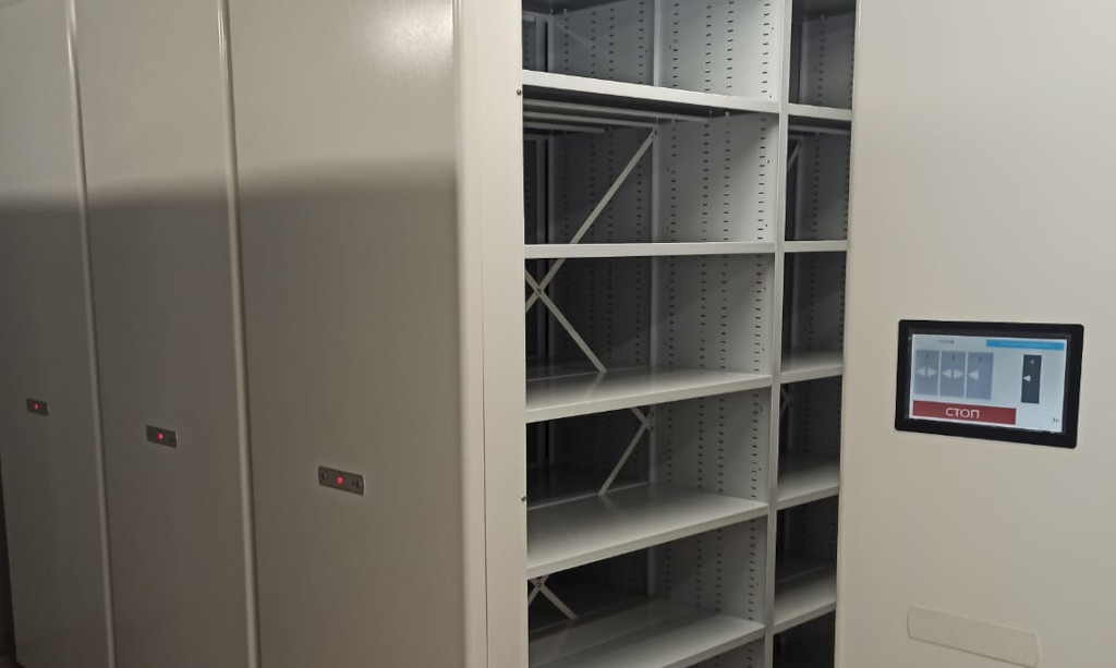 Передвижные стеллажи серии «Актив» с электроприводом предназначены для оборудования архива, библиотеки, склада, музея, картинной галереи.