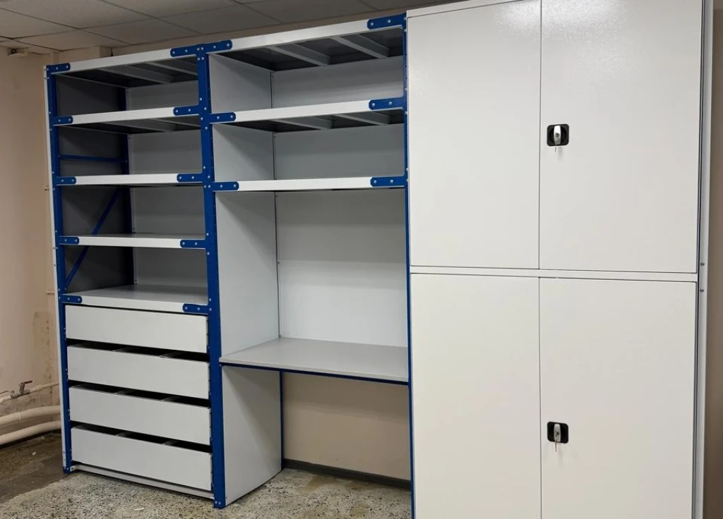 В составе промышленного стеллажа идут двери, полки полного выдвижения с несущей способностью до 200 кг и ящики.