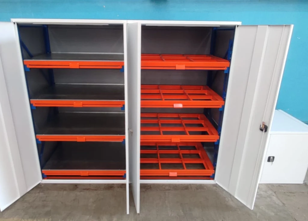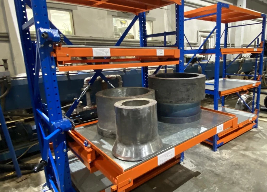 Стеллажи с полками частичного выдвижения для хранения промышленной оснастки, вырубных штампов, фланцев, инструмента и других предметов. Механизм защиты от одновременного выдвижения.