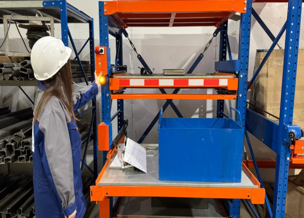 Для обеспечения безопасного хранения вертикального оборудования было разработано дополнительное ограждение на выдвижных полках стеллажей.