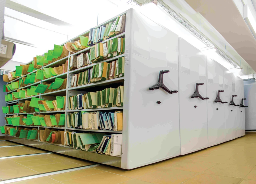 Системы компактного архивного хранения документов. Вдвое повышается вместимость или сокращаются занимаемые площади. Используются двухсторонние передвижные стеллажи для архивохранилища.